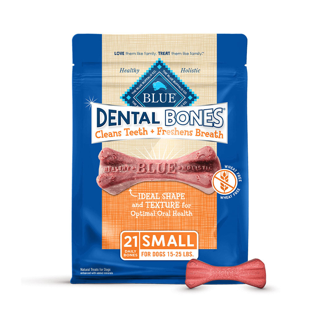 Small BLUE Dental Bones provide natural oral health care in a tasty and highly digestible daily dental chew. Wholesome ingredients plus a chewy texture work together to freshen your dog’s breath, help clean his teeth and maintain healthier gums.